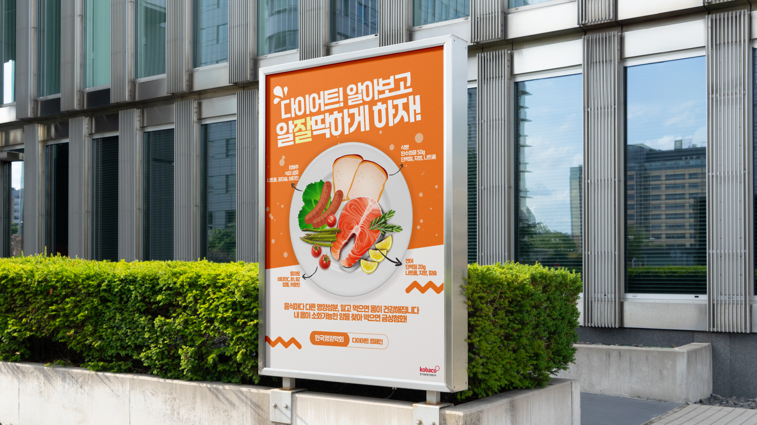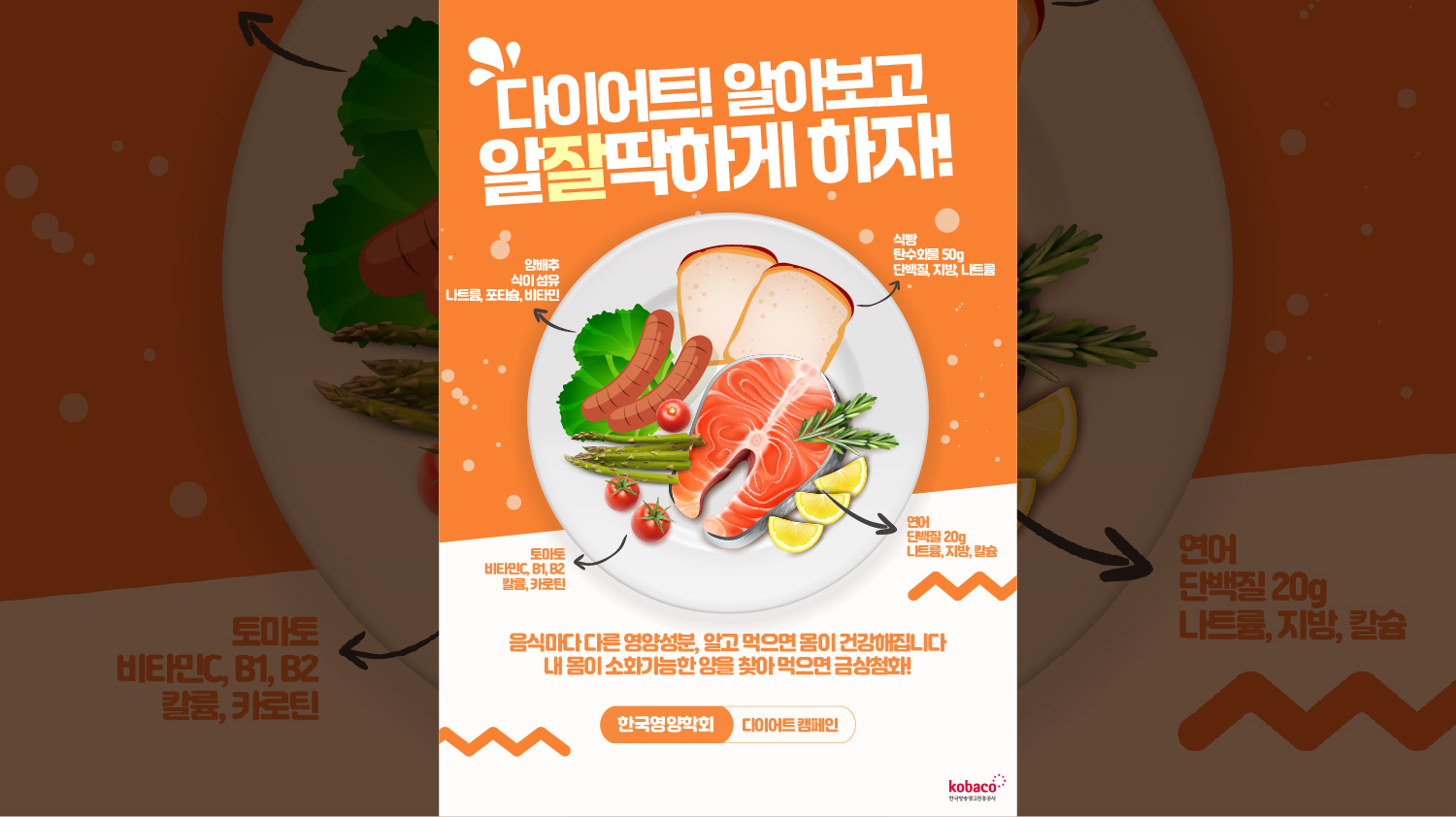 음식 일러스트와 직관적인 지시선을 활용하여 다이어트와 영양 정보라는 메시지를 명확하고